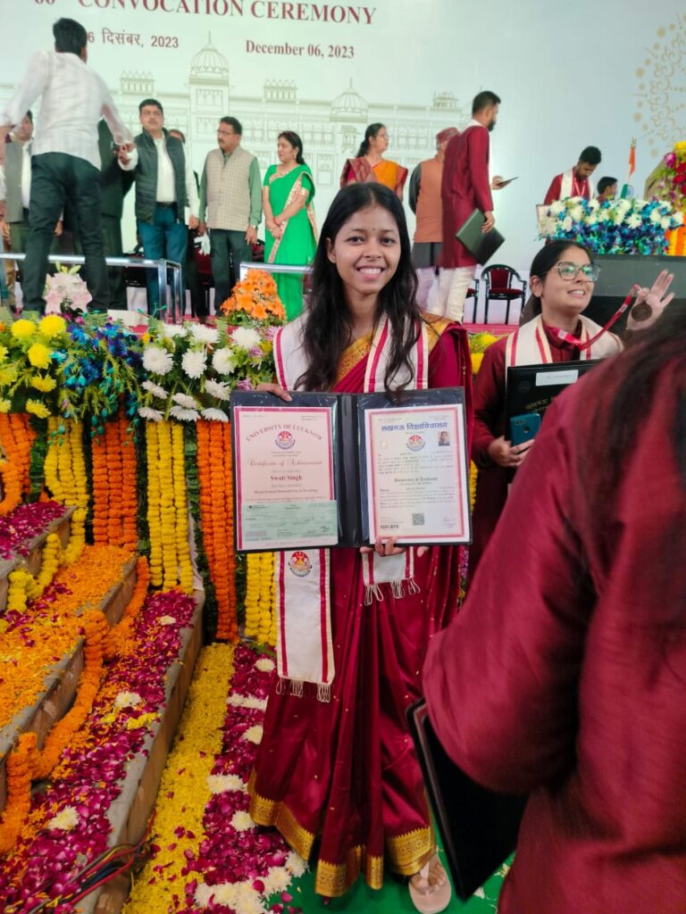 SWATI SINGH, Post Graduate student (2021- 22 to 2022- 23) of the Department of Psychology in Feroze Gandhi College, Rae Bareli was awarded the Bhrigu Prakash Memorial Prize, 2023 in the 66th Convocation of the University of Lucknow held on 06.12.2023 for having secured the highest aggregate percentage of marks in the Papers of Postive Psychology in M.A. (Psychology), Semester- III, 2022- 23 and M.A. (Psychology), Semester- IV, 2022- 23 examinations of the University of Lucknow.
