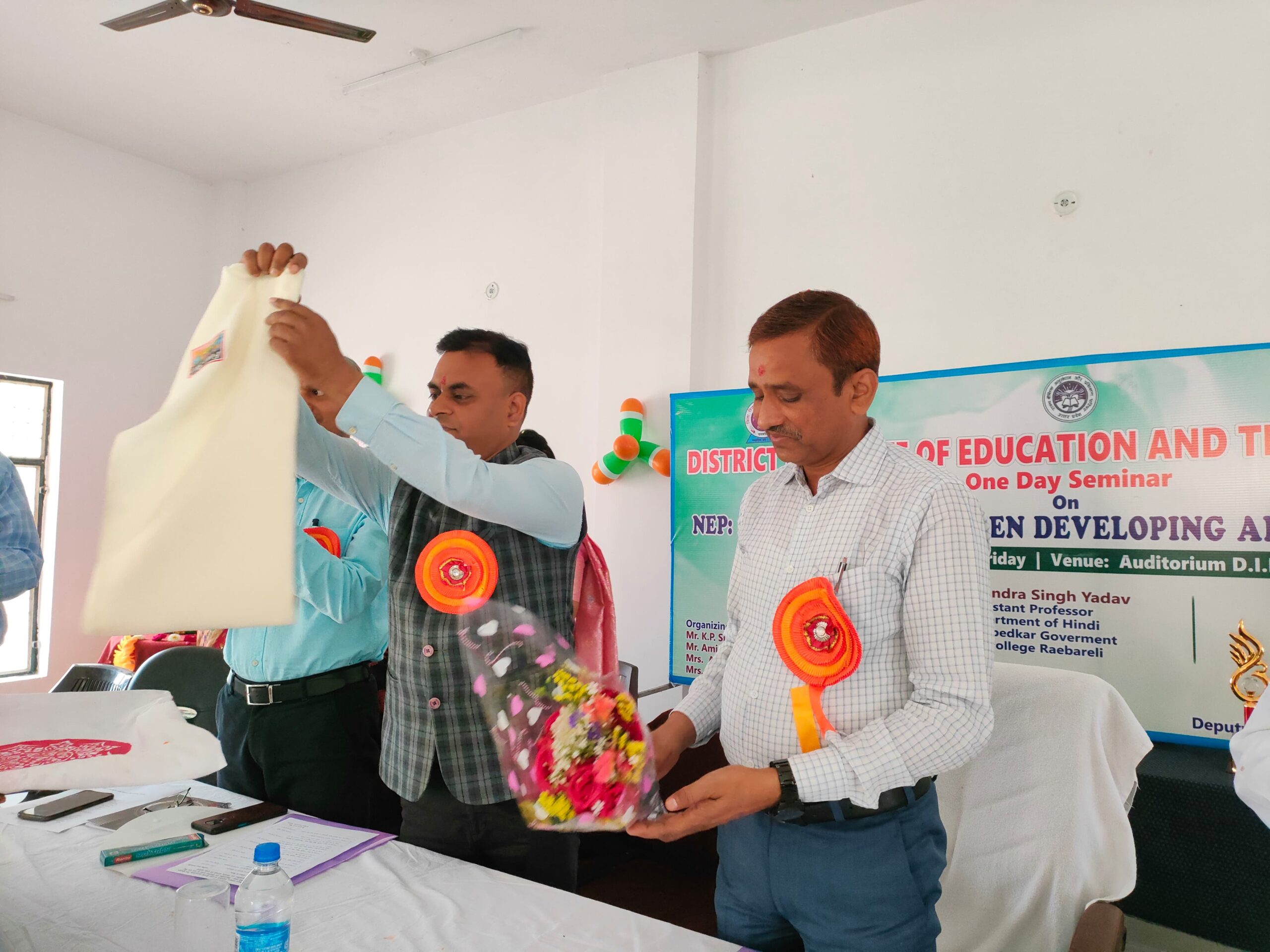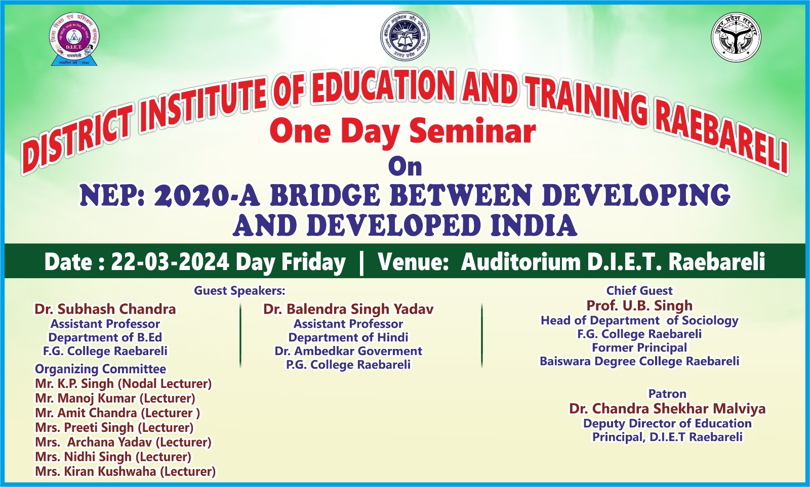 Prof. U.B. Singh, Professor and Head, Department of Sociology, Feroze Gandhi College, Rae Bareli and Shri Subhash Chandra, Assistant Professor, Department of Teacher Education (B.Ed.), Feroze Gandhi College, Rae Bareli delivered their scholarly and thought provoking lectures as the Chief Guest and Guest Speaker respectively in the One- day Seminar on the subject “NEP 2020- A Bridge Between Developing and Developed India” organised by the District Institute of Education and Training, Rae Bareli on 22.03.2024 in the Auditorium of DIET, Rae Bareli.