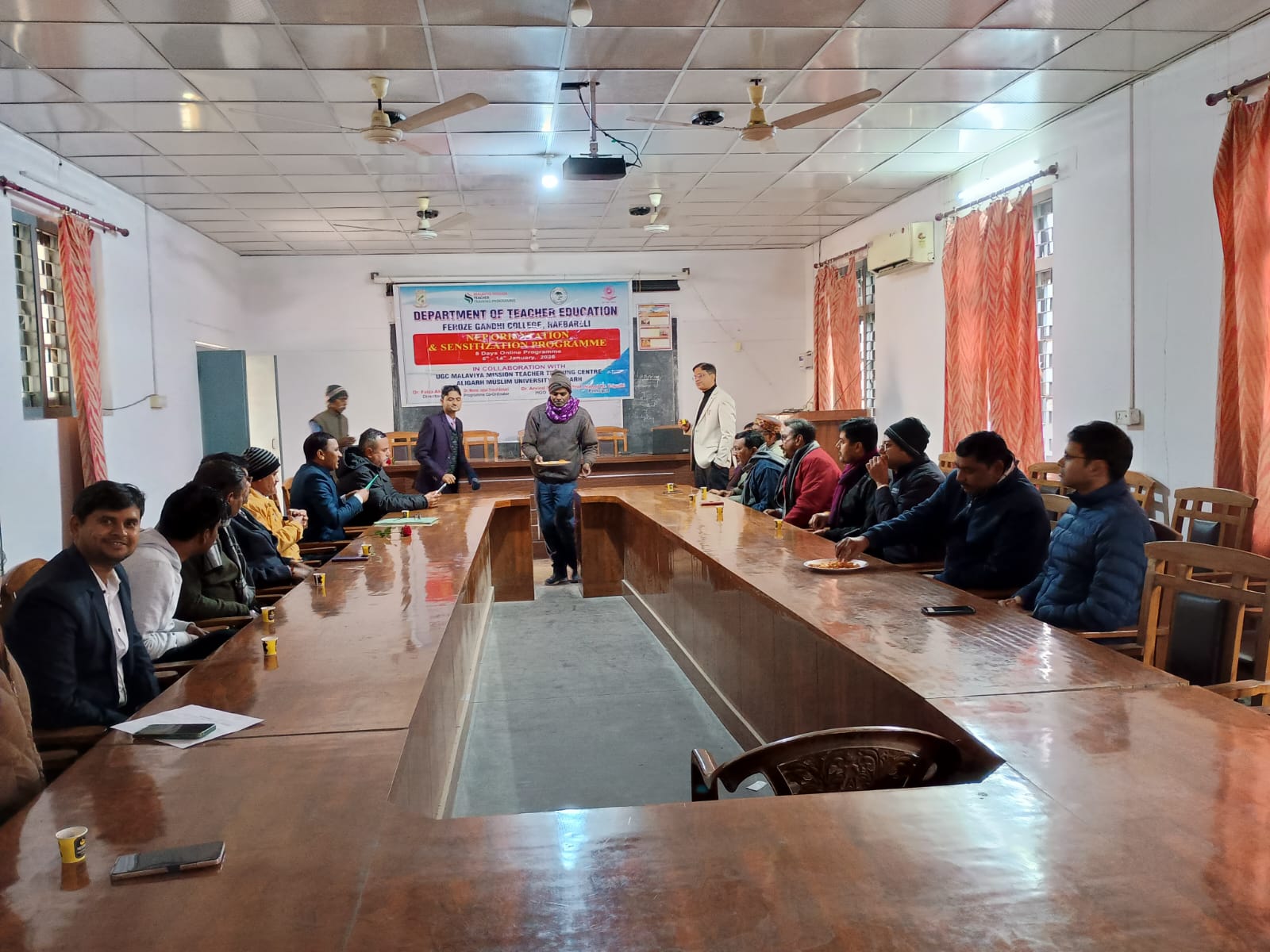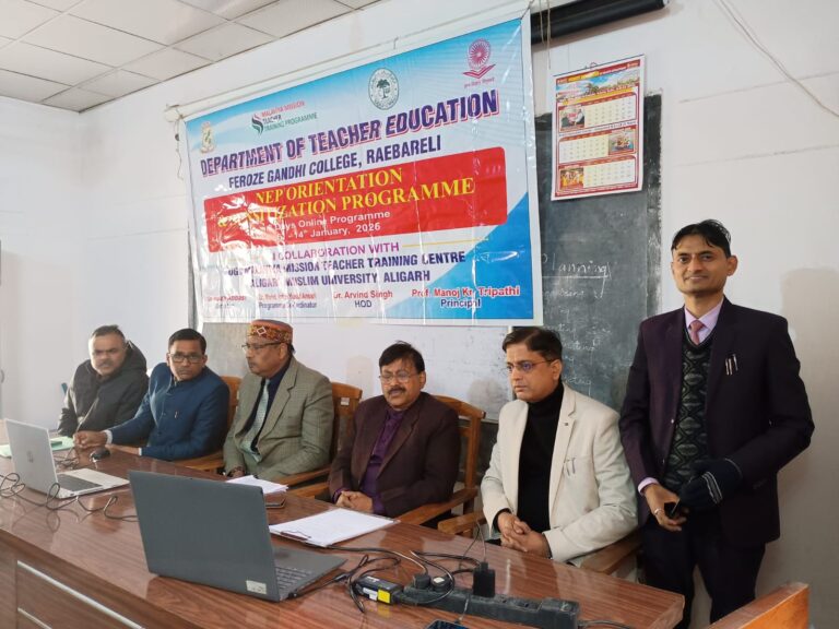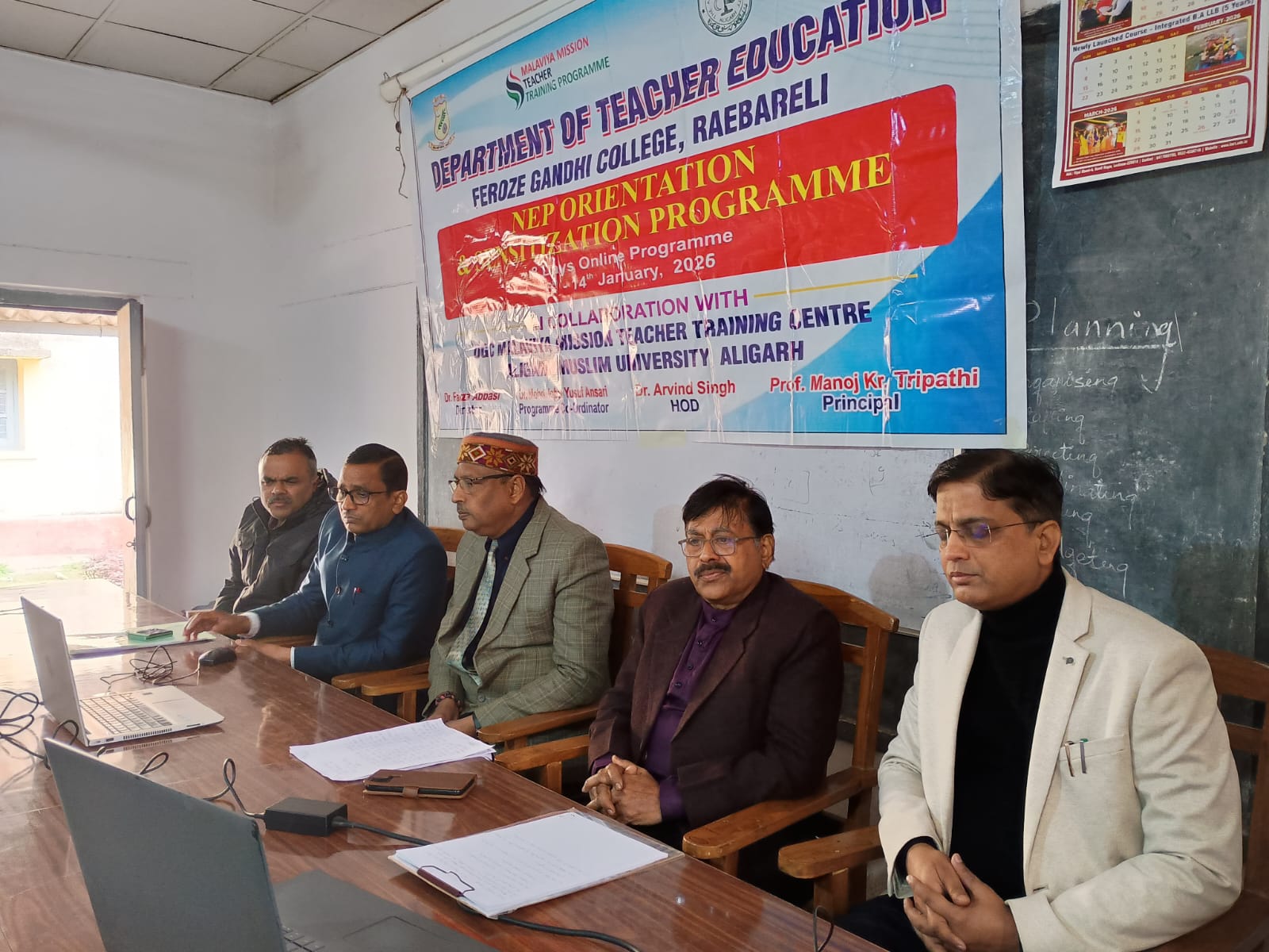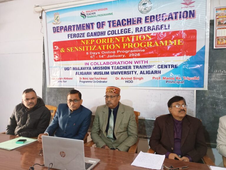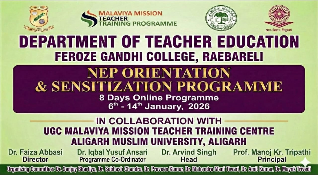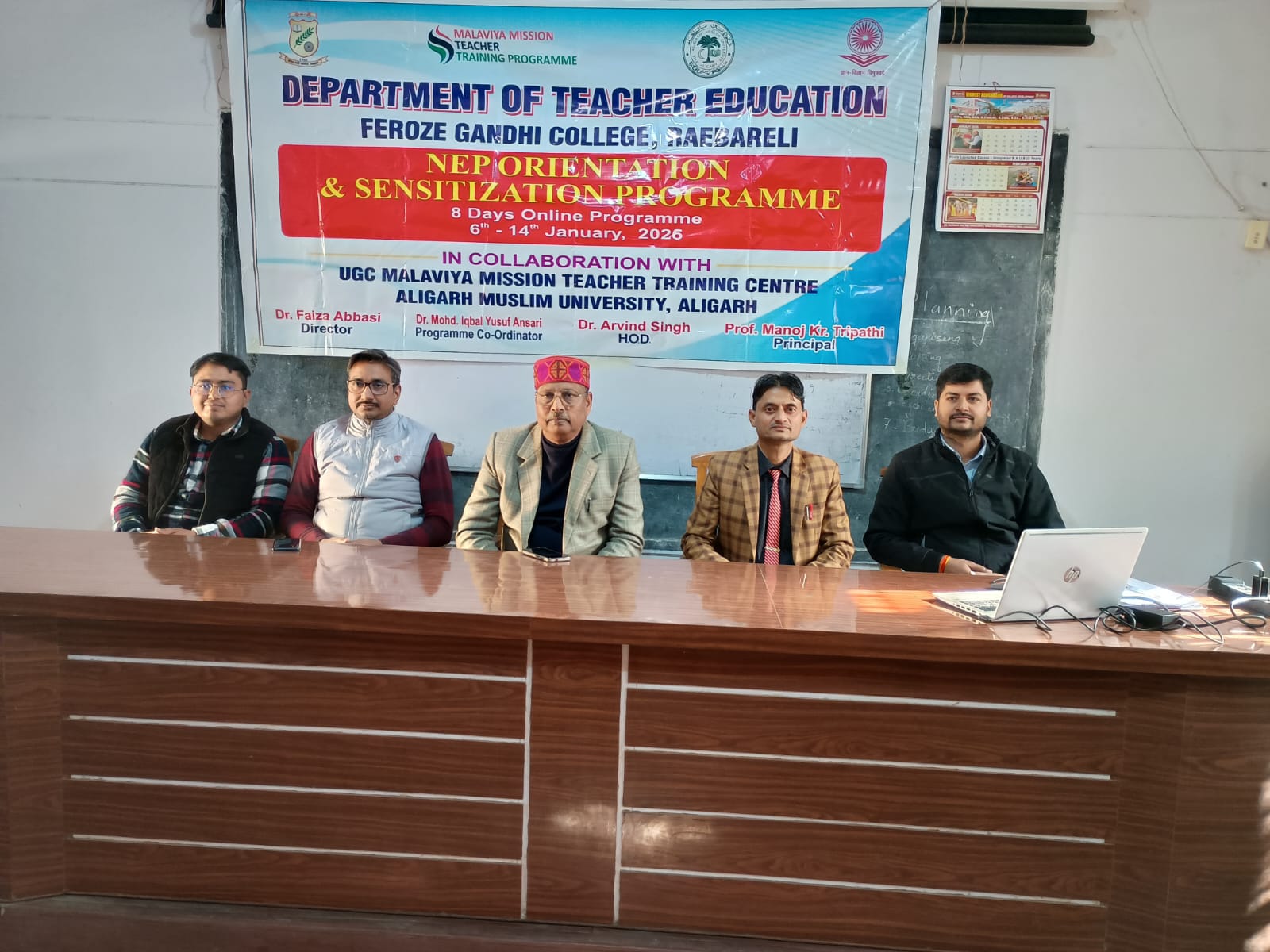 An online ‘NEP Orientation and Sensitisation Programme’ was organised by the Department of Teacher Education, Feroze Gandhi College, Rae Bareli in academic collaboration with Malviya Teacher Training Centre, Aligarh Muslim University from 06.01.2026 to 14.01.2026 in the Conference Room of the Commerce Department, Feroze Gandhi College, Rae Bareli. Dr. Faiza Abbasi, Malviya Teacher Training Centre, Aligarh Muslim University, Aligarh and Dr. Mohammad Iqbal Ansari, Assistant Professor, Department of Teacher Education, Feroze Gandhi College, Rae Bareli functioned as the Programme Director and Programme Coordinator respectively. Eminent domain experts in the field of Education delivered their illuminating and scholarly lectures as Resource Persons in the Programme.