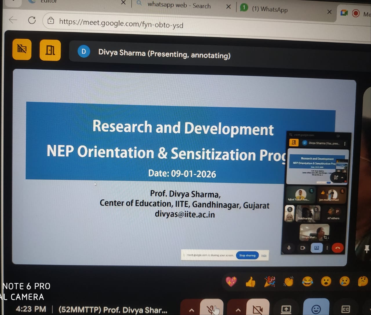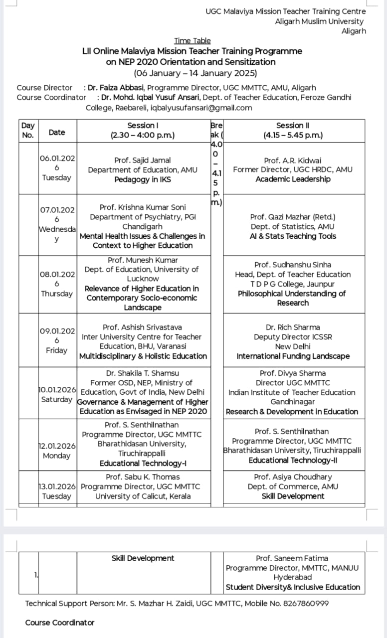 4. Online 'NEP Orientation and Sensitisation Programme' jointly organised by the Department of Teacher Education, Feroze Gandhi College, Rae Bareli and Malviya Teacher Training Mission, Aligarh Muslim University, Aligarh- 06.01.2026 to 14.01.2026.