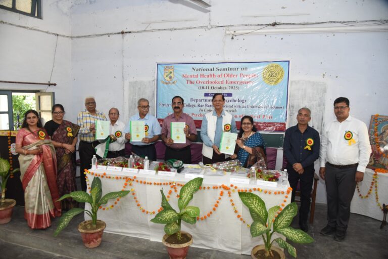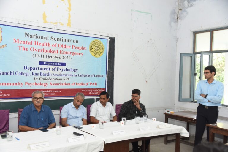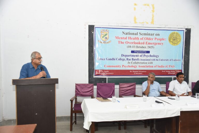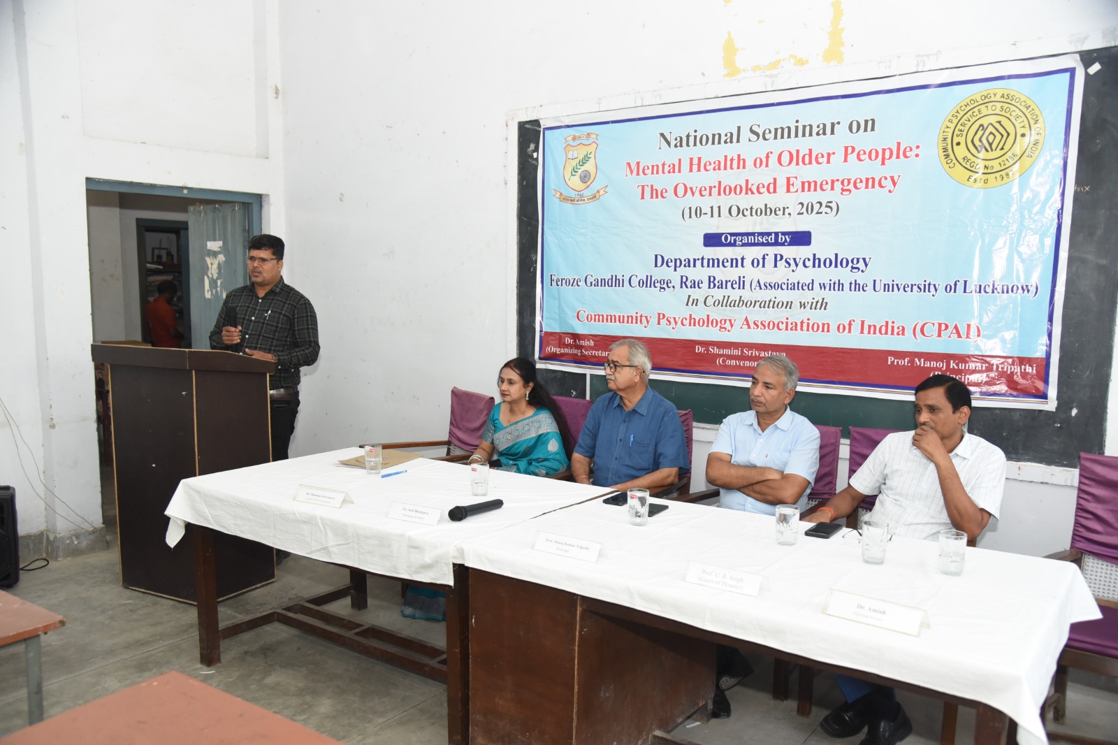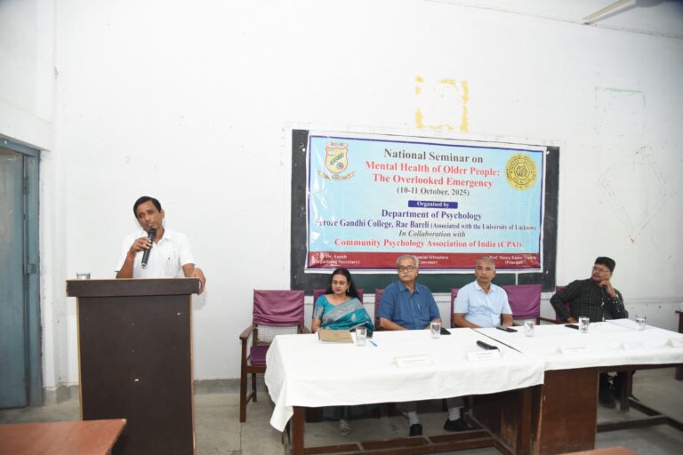 To mark the World Mental Health Day observed every year by the global community of Psychologists and Psychiatrists on the 10th of October, the Department of Psychology, Feroze Gandhi College, Raebareli organised a Two- day National Seminar on “Mental Health of Older People: The Overlooked Emergency” in collaboration with the Community Psychology Association of India on 10.10.2025 and 11.10.2025. The seminar aimed to highlight the often neglected mental health issues of senior citizens and to explore individual, community, and societal approaches for addressing these challenges.