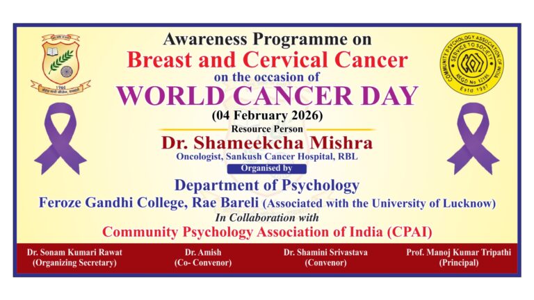Awareness Programme on Breast and Cervical Cancer among the women was organised by the Department of Psychology, Feroze Gandhi College, Rae Bareli in collaboration with the Community Psychology Association of India (CPAI) to mark the World Cancer Day on 04.02.2026. In her address, the Resource Person of the awareness programme, Dr. Shameekha Mishra, Oncologist, Sankush Cancer Hospital, Rae Bareli laid emphasis on spreading awareness and regular health check- ups for the prevention of the disease. The Managing Secretary of the College, Er. Atul Bhargava and the Principal, Prof. Manoj Kumar Tripathi were the Chief Guest and the Guest of Honour of the programme respectively.