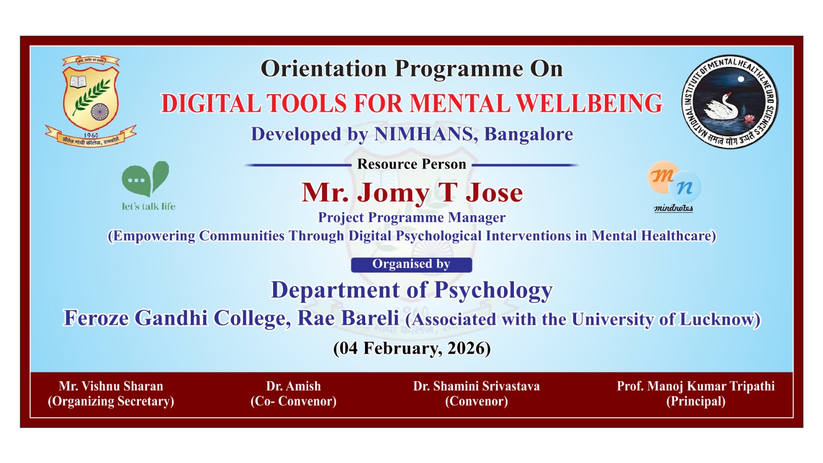 6. Orientation Programme on Digital Tools for Mental Well- Being organised by the Department of Psychology, Feroze Gandhi College, Rae Bareli in collaboration with NIMHANS, Bangalore- 04.02.2026.
