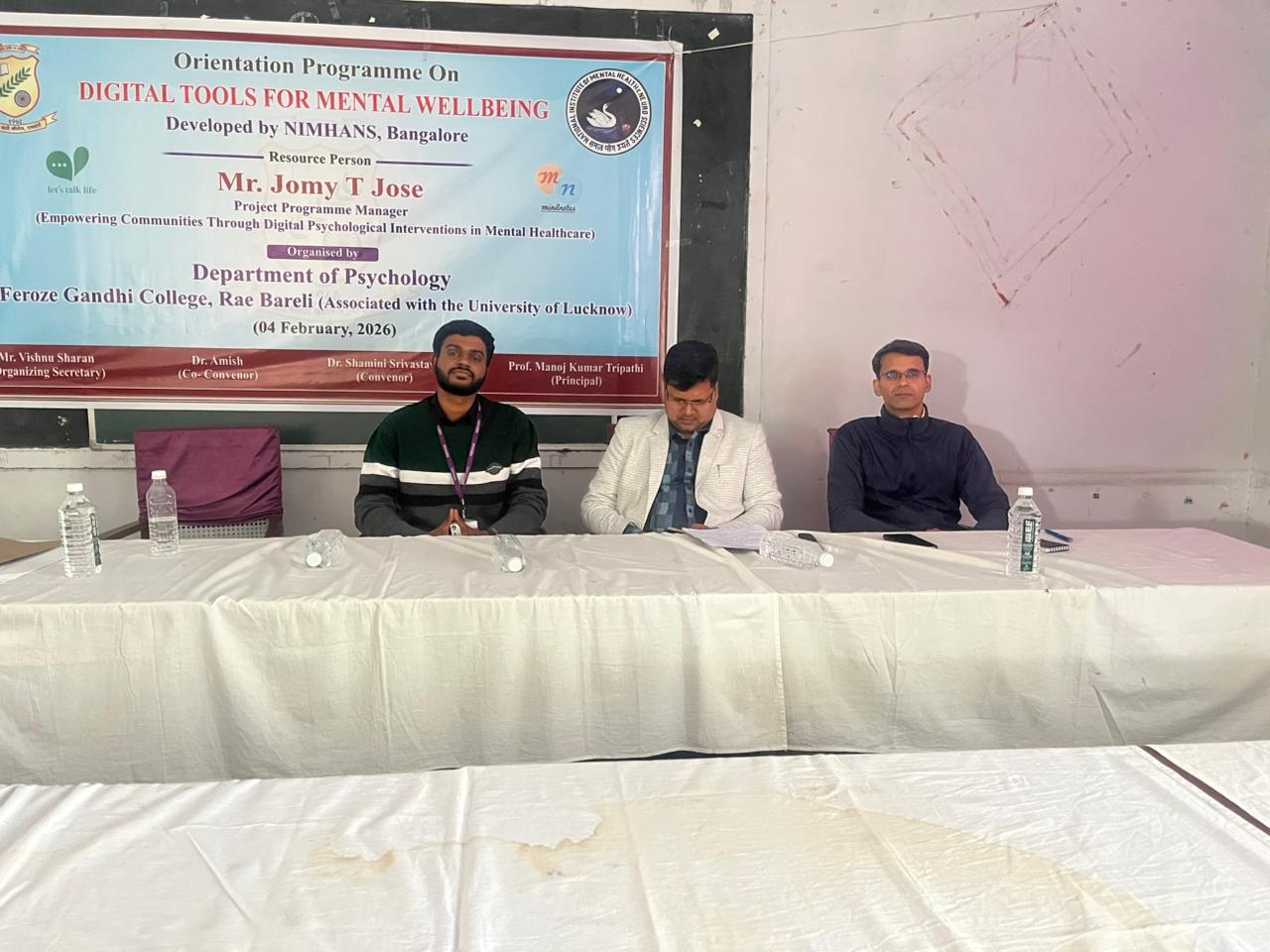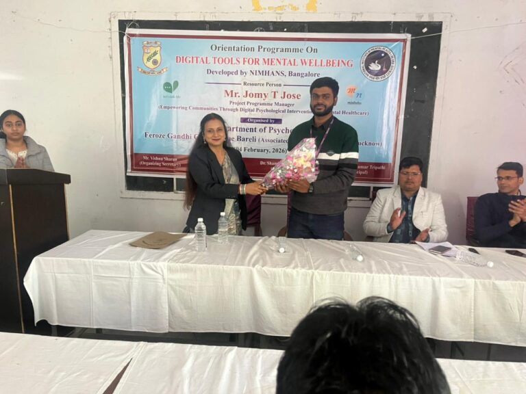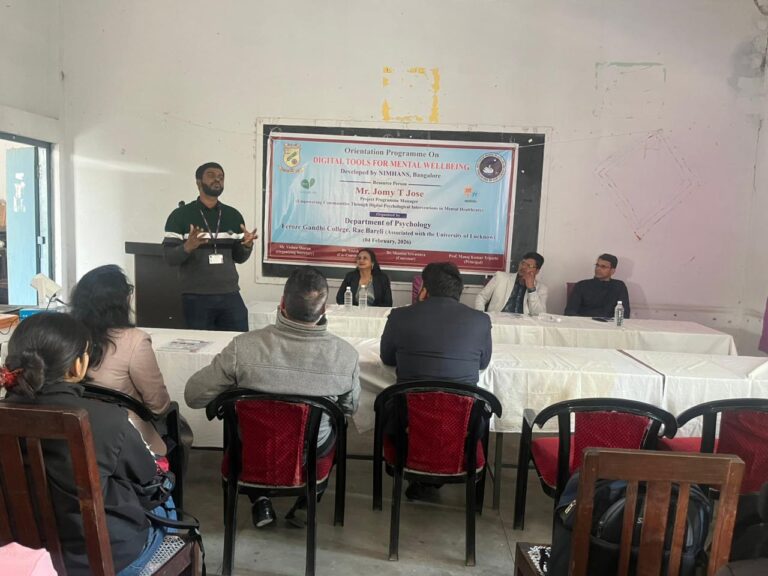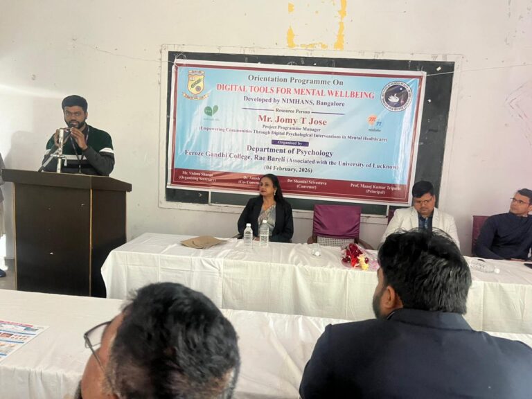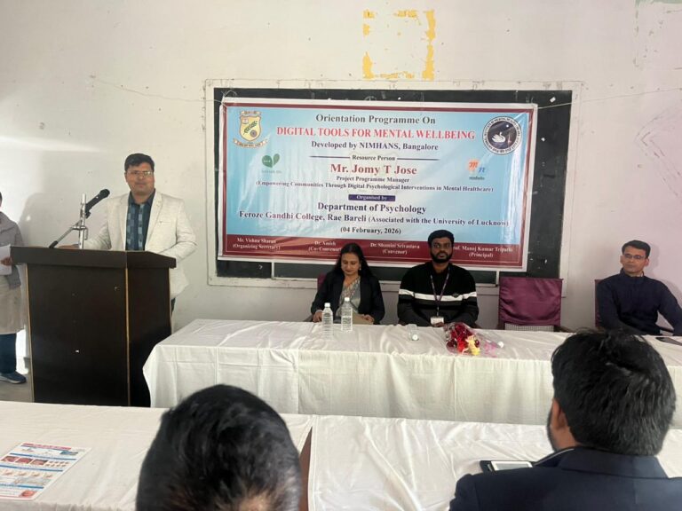 A one- day Orientation Programme on Digital Tools for Mental Well- Being was organised by the Department of Psychology, Feroze Gandhi College, Rae Bareli in collaboration with the National Institute of Mental Health and Neuro Sciences, Bangalore on 04.02.2026. Mr. Jomy T. Jose of NIMHANS, Project Manager, Empowering Communities through Digital Psychological Interventions in Mental Healthcare was the Resource Person of the Orientation Programme.
