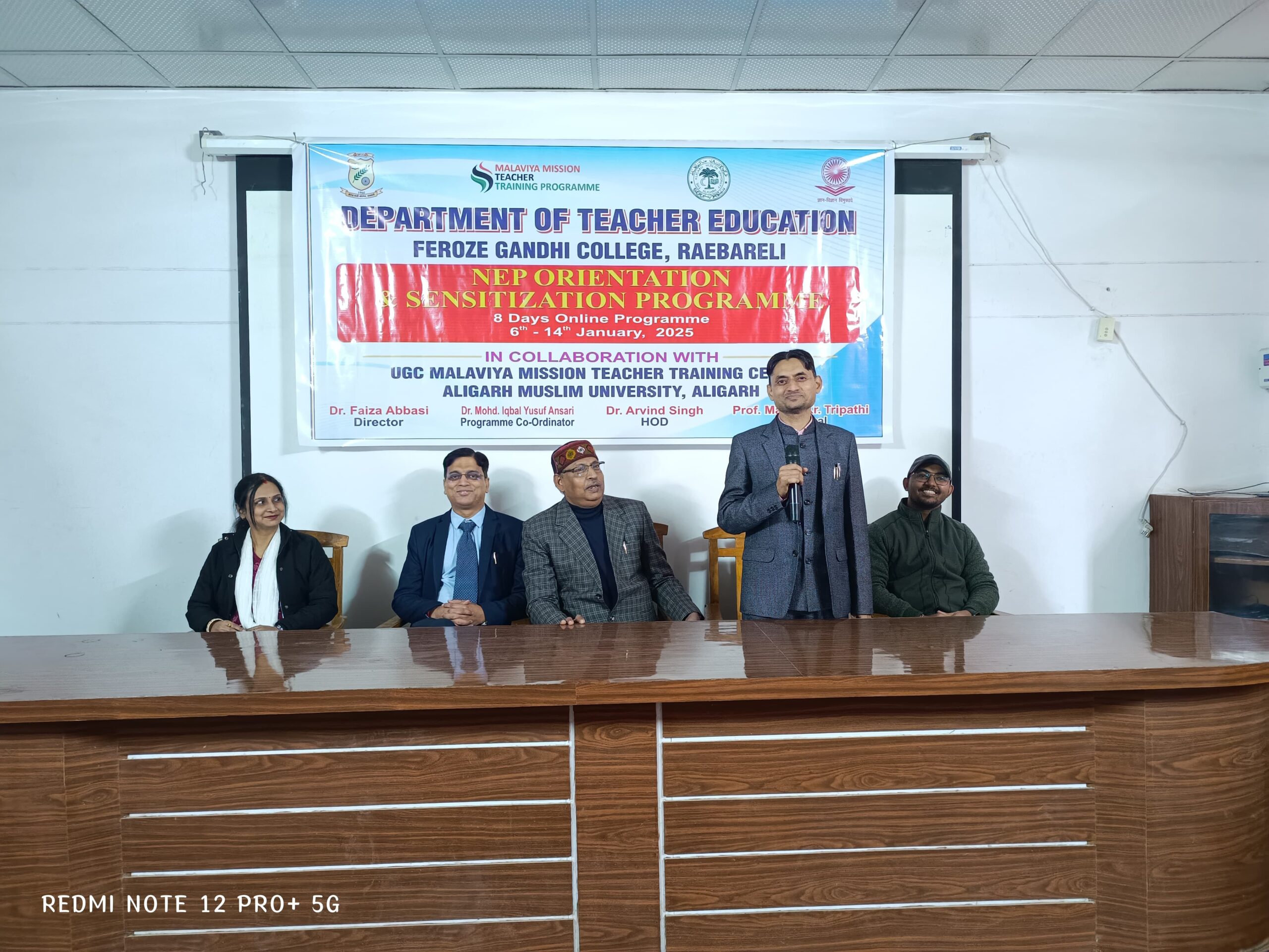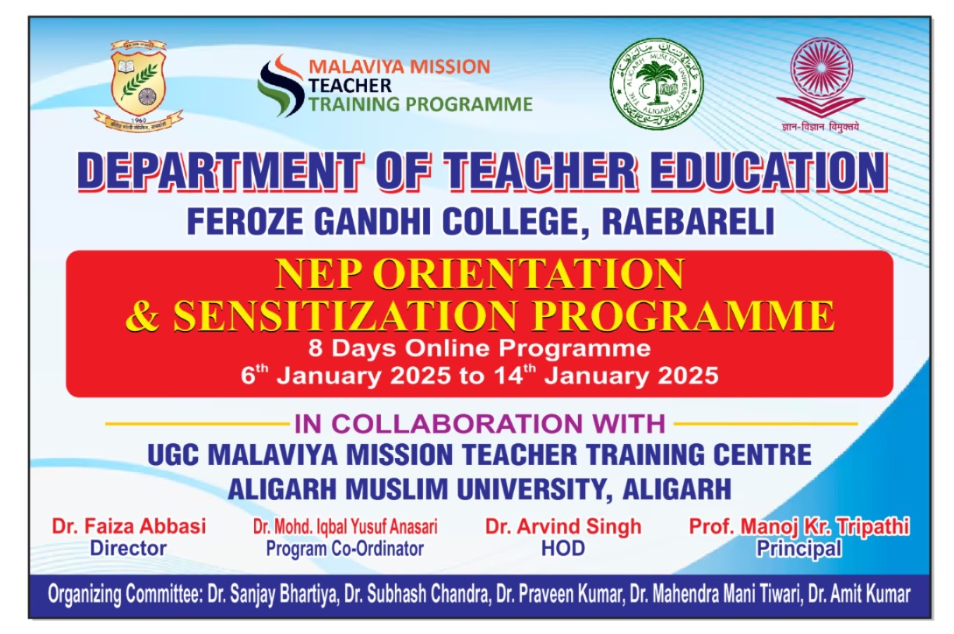 An online ‘NEP 2020 Orientation and Sensitisation Programme’ was organised by the Department of Teacher Education, Feroze Gandhi College, Rae Bareli in academic collaboration with Malviya Teacher Training Centre, Aligarh Muslim University from 06.01.2025 to 14.01.2025 in the Conference Room of the Commerce Department, Feroze Gandhi College, Rae Bareli. Dr. Faiza Abbasi, Malviya Teacher Training Centre, Aligarh Muslim University, Aligarh and Dr. Mohammad Iqbal Ansari, Assistant Professor, Department of Teacher Education, Feroze Gandhi College, Rae Bareli functioned as the Programme Director and Programme Coordinator respectively. Eminent domain experts in the field of Education delivered their illuminating and scholarly lectures as Resource Persons in the Programme.