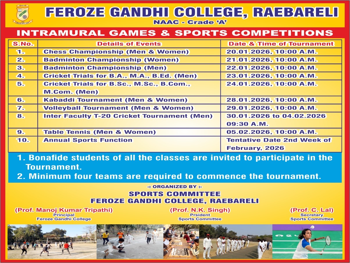 2. Intra- Collegiate Badminton Championship for the students of Feroze Gandhi College, Rae Bareli- 09.12.2024 and 10.12.2024.